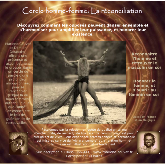 Cette question de la relation entre homme et femme est une part très importante de notre vie et elle peut nous prendre beaucoup d'énergie alors que l'alliance de ces opposés pourrait nous porter et nous révéler l'un à l'autre.
